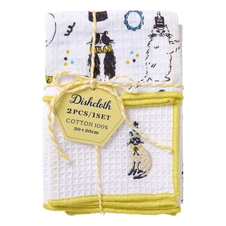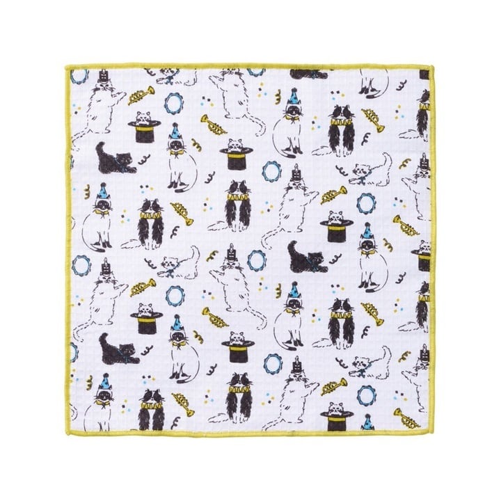 マジシャンのネコちゃんをモチーフとしたプリント柄と刺繍のキュートなキッチンクロス。